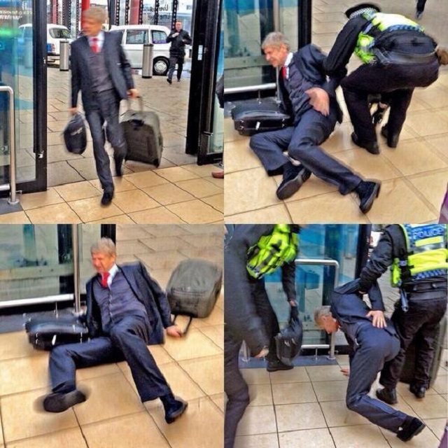 Szombaton a bajnoki címre hajtó Arsenal megsemmisítő, 5-1-es vereséget szenvedett a Liverpool FC-től az Anfield Roadon a Premier League 25. fordulójában úgy, hogy már a 20. percben négygólos hátrányban volt. De nem ez volt az egyetlen hasraesés aznap. A csapat menedzsere, a mindig kimért modoráról ismert Wenger Arnold (Arsene Wenger) a Lime Street-i állomás kapujában hatalmasat borult a csomagjaival, akaratlanul is szolidarítva játékosaival: egy zakó ott, egy zakó itt. A szakembernek szerencsére nem esett komolyabb baja. Képek.
