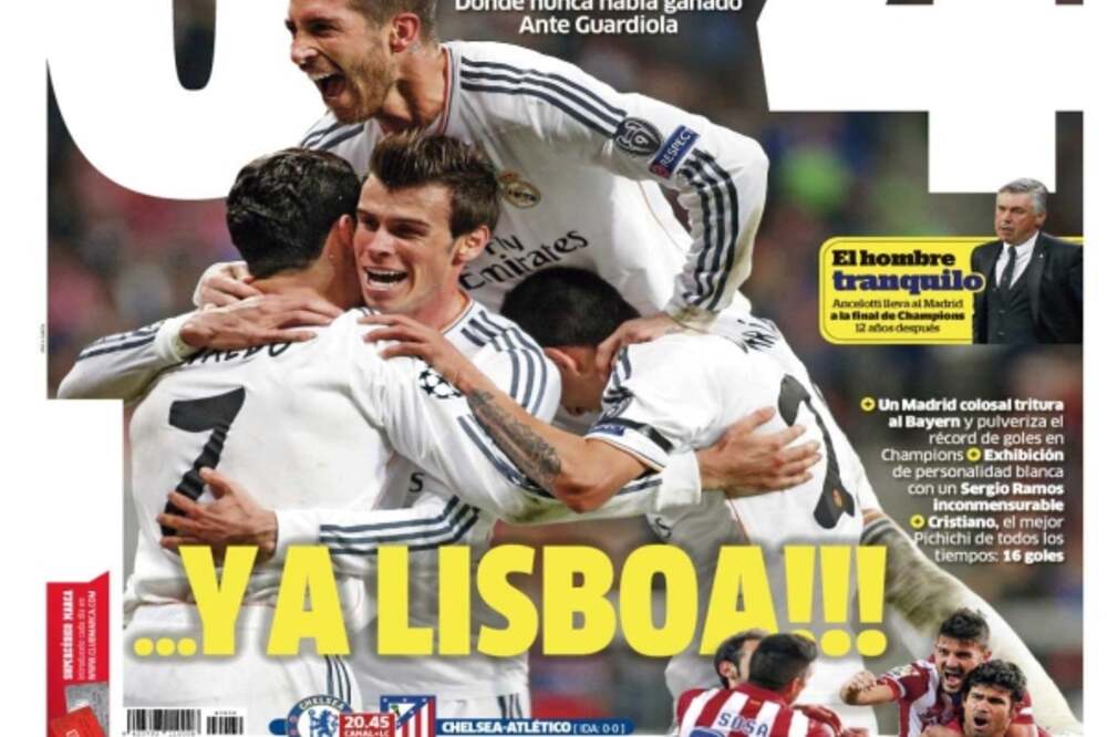 Meglepetés, de a Marca nem verte annyira nagy dobra, hogy a Real Madrid 12 év után ismét BL-döntőbe jutott. A hozsannázó szövegeket az újságban kell keresni, a címlapon csak ennyivel intézték el az egészet: 0–4 és Lisszabon. Továbbá sok szerencsét kívántak az Atlético Madridnak, amely ma este a Chelsea ellen lép pályára...