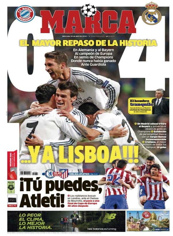 Meglepetés, de a Marca nem verte annyira nagy dobra, hogy a Real Madrid 12 év után ismét BL-döntőbe jutott. A hozsannázó szövegeket az újságban kell keresni, a címlapon csak ennyivel intézték el az egészet: 0–4 és Lisszabon. Továbbá sok szerencsét kívántak az Atlético Madridnak, amely ma este a Chelsea ellen lép pályára...