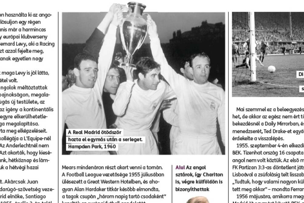 Hogyan született meg a BEK? isten áldja az angol gőgöt! 1954. december 14-én a Daily Mail meghatározó szerepet játszott a BEK megszületésében, méghozzá egy főcímmel: „Éljen a Wolves, a világ bajnokcsapata!”. Így reagált a napilap arra, hogy a Wolverhapton Wanderers 3:2-re győzött a négy, valaha élt legnagyobb magyar játékost, Bozsik Józsefet, Czibor Zoltánt, Kocsis Sándort és Puskás Ferencet soraiban tudó Honvéd ellen. A Molineux-pályát négy napja folyamatosan áztatta az eső, de a Wolves menedzsere, Stan Cullis ennek ellenére is utasította játékosait, köztük a fiatal szélsőt, Ron Atkinsont, hogy ők is locsolják még egy kicsit. A Honvéd 2:0-ra vezetett, de nem bírta tovább a dagonyázást, és kikapott ellenfelétől, amely egyre keményebben szigetelte el Puskást és Kocsist. A meccset követően az öltözőben Cullis bejelentette, hogy csapataa világ legjobbja, a világ bajnoka. A francia L'Equipe újságírója, Gabriel Hanot Párizsban válaszolt. „Előbb várjuk meg, amíg a Wolves ellátogat Moszkvába és Budapestre, utána nézzük meg, vajon tényleg legyőzhetetlenek-e – írta a francia válogatott szélsőjéből, majd edzőből lett újságíró. – És vannak még egyéb nagy klubok is, például a Real Madrid és a Milan.”