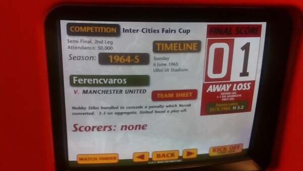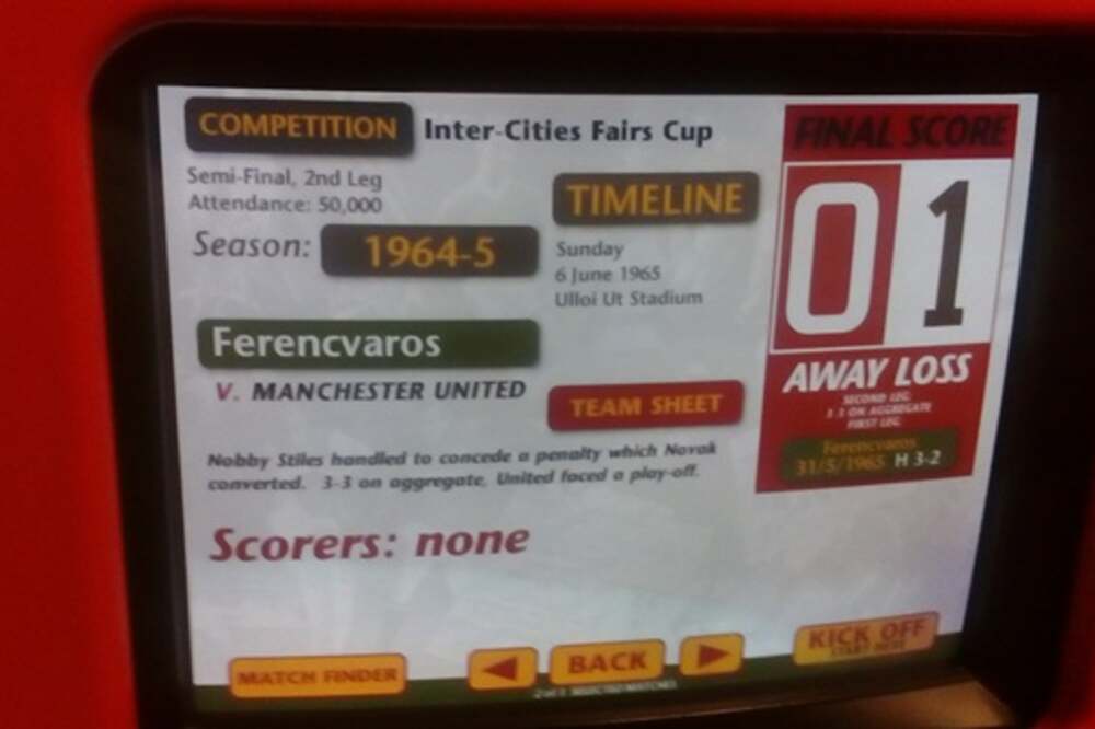 Az angol csapat múzeumában falba épített monitoron idézhetik fel a United történelmének legfontosabb mérkőzéseit. Az érintőképernyős alkalmazásba belépve a látogató először kiválaszthatja az ellenfelet, ezt követően pedig további részleteket is megtudhat az adott találkozóról, például a Manchsester United összeállítását is megnézheti. Így találtunk rá a Ferencváros és a Zalaegerszeg elleni összecsapásokra is. A zöld-fehérekkel 1965-ben, a Vásárvárosok Kupájának elődöntőjében futott össze a Ferencváros, s az akkori szabályok szerint harmadik mérkőzésre volt szükség, miután az első meccset 3-2-re az angolok, a visszavágót pedig 1-0-ra a mieink nyerték. A mindent eldöntő találkozót a Ferencváros nyerte 2-1-re, így bejutott a döntőbe, amelyet meg is nyert a Juventusszal szemben.