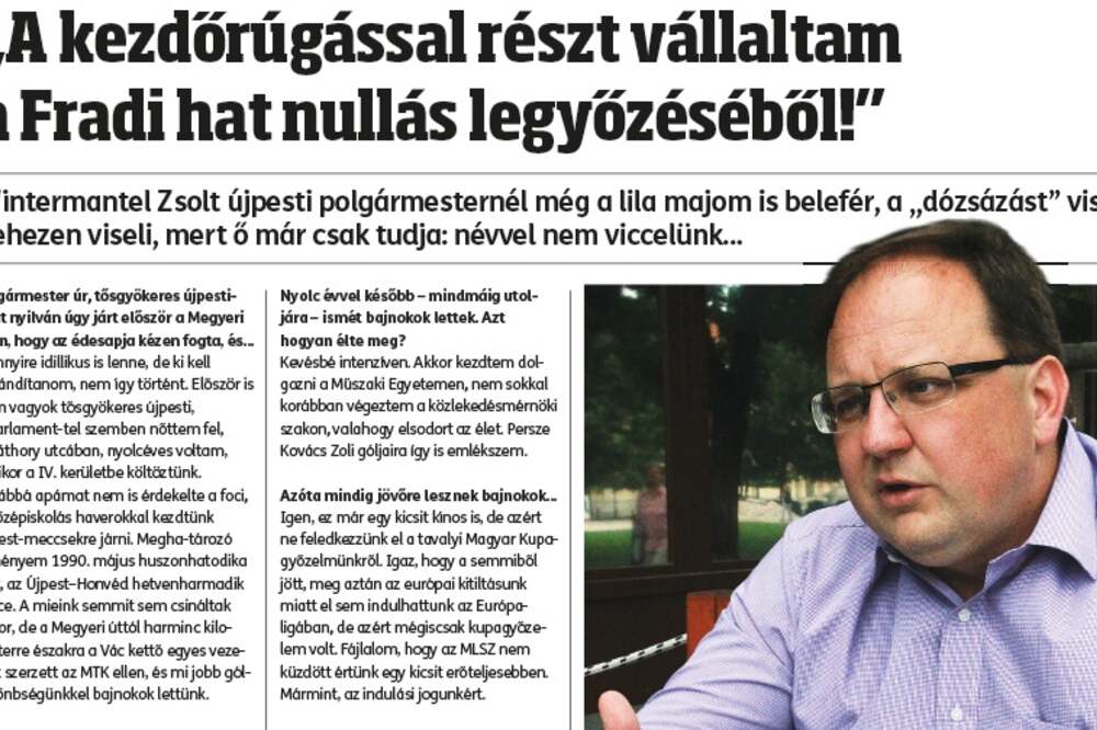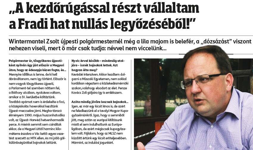Polgármester úr, tősgyökeres újpestiként nyilván úgy járt először a Megyeri úton, hogy az édesapja kézen fogta, és… Mennyire idillikus is lenne, de ki kellábrándítanom, nem így történt. Először is nem vagyok tősgyökeres újpesti, a Parlamenttel szemben nőttem fel, a Báthory utcában, nyolcéves voltam, amikor a IV. kerületbe költöztünk.Továbbá apámat nem is érdekelte a foci, a középiskolás haverokkal kezdtünk Újpest-meccsekre járni. Meghatározóélményem 1990. május huszonhatodika volt, az Újpest–Honvéd hetvenharmadik perce. A mieink semmit sem csináltakekkor, de a Megyeri úttól harminc kilométerre északra a Vác kettő egyes vezetést szerzett az MTK ellen, és mi jobb gólkülönbségünkkel bajnokok lettünk.