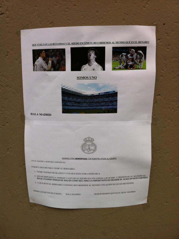 Mint ismert, a királyi gárda a BL-elődöntő első meccsén 4-1-es vereséget szenvedett a Borussia Dortmund otthonában, a spanyol szurkolók azonban nem mondtak le a továbbjutásról: napokkal a visszavágó előtt példátlan kampány kezdődött a Bernabéu környékén, ahol több tucat kiragasztott szórólap szólítja csatába a Real Madrid-szurkolókat.