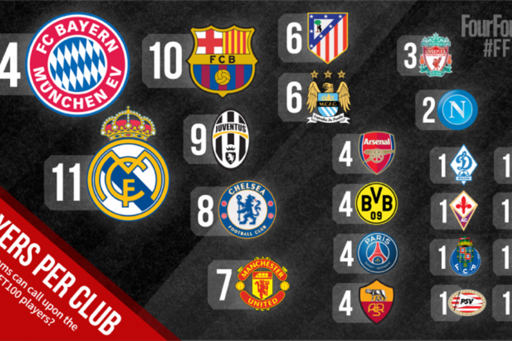 Egyesek számára elképzelhetetlen, mégis igaz, hogy az angol FourFourTwo százas listájára egy német csapat, a Bayern München adja a legtöbb játékost, szám szerint tizennégyet. A „képzeletbeli dobogó" második és harmadik fokára a két spanyol sztárcsapat, a Real Madrid és a Barcelona „léphetett fel”. Sokaknak meglepetés, hogy a negyedik helyre a Juventus ért oda, a Chelsea pedig – első angol csapatként a maga nyolc játékosával – a lista ötödik helyén található. Szintén meglepő, hogy míg az elmúlt évek legrosszabb teljesítményével kirukkoló Manchester United hét játékost is „ad” a százas listára, addig a spanyol bajnoki címet, és BL-ezüstöt szerző Atlético Madrid hatot – pont annyit, mint a regnáló angol bajnok Machester City. A százas listára egyaránt négy játékost delegál a Borussia Dortmund, az Arsenal, a Roma és a PSG, hármat a Liverpool, és kettőt a Napoli. A fennmaradó nyolc helyre nyolc csapatból kerültek ki a jelöltek, hiszen a Dinamo Moszkva, a Portó, a Fiorentina, a PSV, a Tottenham, a Wolfsburg, a Zenit és az Udinese is ad egy-egy játékost. És hogy hogyan rangsorolták az angolok a futballistákat? Figyeld a fourfourtwo.hu-t, mert minden nap elárulunk valamit a listáról.