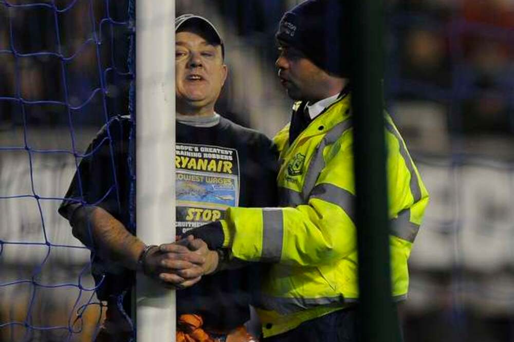 Szokatlan jelenet zavarta meg az angol bajnokság hétközi fordulójában kedden rendezett Everton–Manchester City mérkőzést. A 40. percben a játékvezető kénytelen volt megállítani a játékot, mert egy szurkoló a City bal kapufájához bilincselte magát. A hamarosan megérkező biztonságiaknak jó öt percébe telt, amíg ki tudták szabadítani bilincséből a pulóverén lévő felirattal az egyik légitársaság ellen tiltakozó szurkolót.