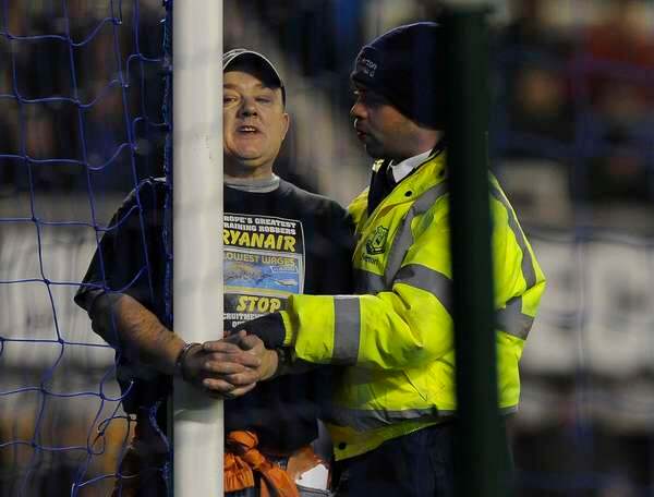 Szokatlan jelenet zavarta meg az angol bajnokság hétközi fordulójában kedden rendezett Everton–Manchester City mérkőzést. A 40. percben a játékvezető kénytelen volt megállítani a játékot, mert egy szurkoló a City bal kapufájához bilincselte magát. A hamarosan megérkező biztonságiaknak jó öt percébe telt, amíg ki tudták szabadítani bilincséből a pulóverén lévő felirattal az egyik légitársaság ellen tiltakozó szurkolót.