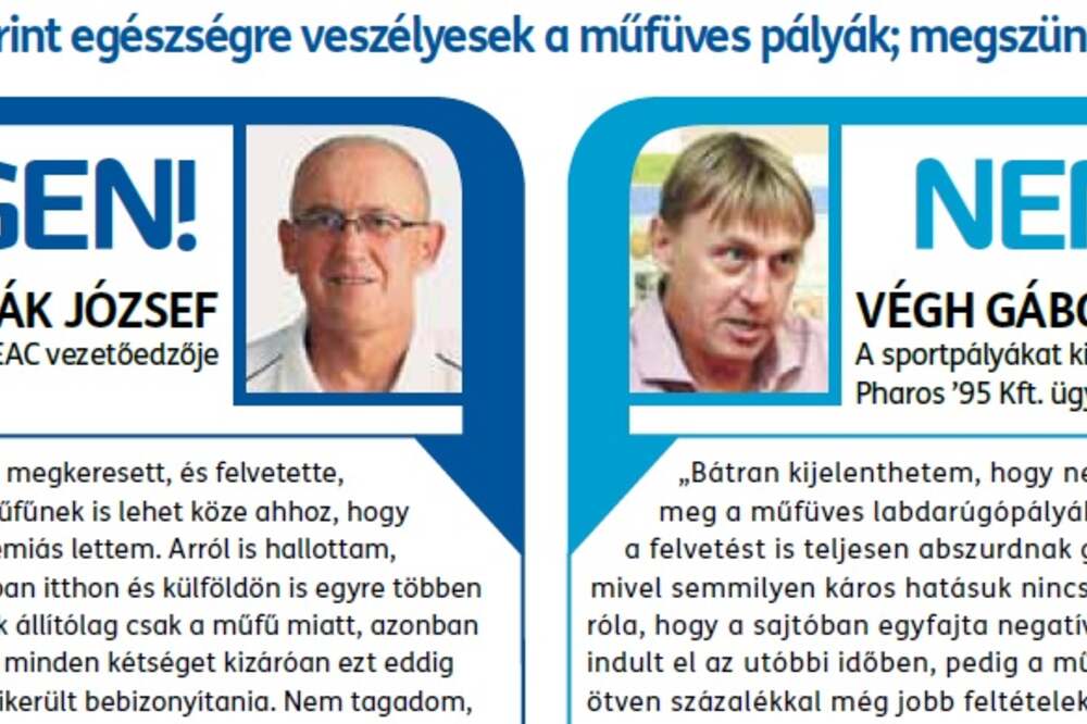 Végh Gábor véleménye: „Bátran kijelenthetem, hogy nem szüntetném meg a műfüves labdarúgópályákat, sőt már a felvetést is teljesen abszurdnak gondolom, mivel semmilyen káros hatásuk nincsen. Én is tudok róla, hogy a sajtóban egyfajta negatív kampány indult el az utóbbi időben, pedig a műfüves pályák ötven százalékkal még jobb feltételeket is tudnak nyújtani, mint a hagyományos borításúak. Ismerem az ezzel kapcsolatos alaptalan híreket, teljesen kizárható, hogy a műfű szilikózist, leukémiát vagy akármilyen más betegséget idézzen elő.” (…)