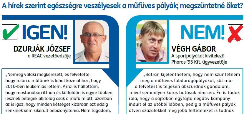 Végh Gábor véleménye: „Bátran kijelenthetem, hogy nem szüntetném meg a műfüves labdarúgópályákat, sőt már a felvetést is teljesen abszurdnak gondolom, mivel semmilyen káros hatásuk nincsen. Én is tudok róla, hogy a sajtóban egyfajta negatív kampány indult el az utóbbi időben, pedig a műfüves pályák ötven százalékkal még jobb feltételeket is tudnak nyújtani, mint a hagyományos borításúak. Ismerem az ezzel kapcsolatos alaptalan híreket, teljesen kizárható, hogy a műfű szilikózist, leukémiát vagy akármilyen más betegséget idézzen elő.” (…)
