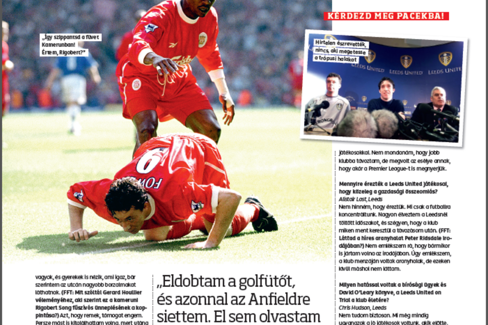 Robbie Fowler behív minket, és kacsint egyet. Ez még nekünk is új. Az elmúlt csaknem húsz évben még sohasem kaptunk ajánlatot futballistától. Na jó, de olyan sem volt még, hogy Robbie Fowlerrel ücsörögtünk volna egy lakókocsiban. Pacekot viszont angol anyalapunk már készített vele. Akkor most mégis miért vagyunk itt ebben a félig üzemelő malomban, Manchester külvárosában a szélfútta délutánon, miért tesszük fel kérdéseinket másodszor is a Liverpool FC egykori legendás csatárának? Egyszerű. 2002-ben Fowler mindössze 26 éves volt. Épp félúton járt két súlyosabb, Leedsnél elszenvedett sérülése közül a második kiheveréséhez. Ekkor a Manchester City, a visszatérés Liverpoolba, a walesi kiküldetés, Ausztrália és Thaiföld még a láthatáron sem volt. Nem vitattuk meg neveltetését, élete néhány nagy ellentmondását, és a híres 1999-es „csíkfelszívós” gólöröme, illetve Graeme Le Saux-val történt incidense is alig kapott néhány mondatot. Mostanra idősebb és sokkal bölcsebb lett, haja is őszül. Az olvasók kérdéseire üdítő őszinteséggel válaszol liverpooli tájszólásában. Magával ragadó, ahogy a futballra jár az agya, előbb vagy utóbb – inkább előbb – ezt az edzői pályán is kamatoztatná. Kíváncsi vagy arra, vajon elfogadta Le Saux a bocsánatkérését? Vagy direkt hagyott ki egy büntetőt? Esetleg lehetett volna többször is válogatott? Na és hogy milyen volt a világ másik oldalán?