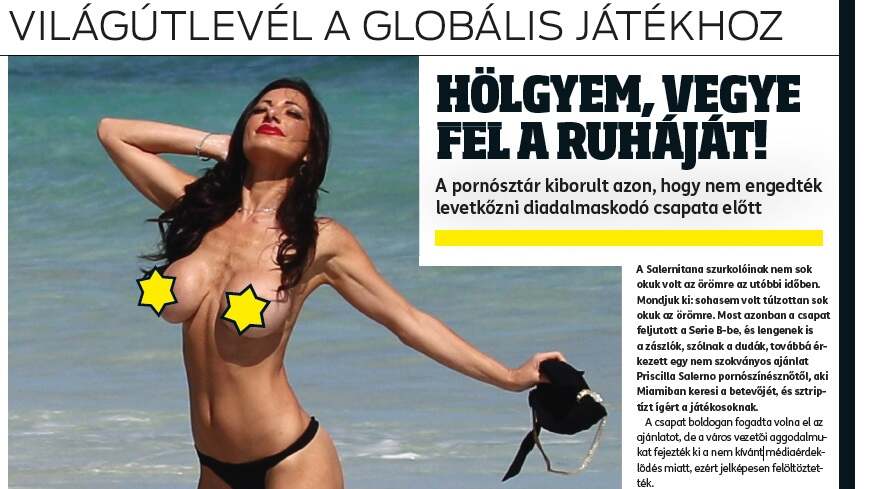 A Salernitana szurkolóinak nem sok okuk volt az örömre az utóbbi időben. Mondjuk ki: sohasem volt túlzottan sok okuk az örömre. Most azonban a csapat feljutott a Serie B-be, és lengenek is a zászlók, szólnak a dudák, továbbá érkezett egy nem szokványos ajánlat Priscilla Salerno pornószínésznőtől, aki Miamiban keresi a betevőjét, és sztriptízt ígért a játékosoknak.