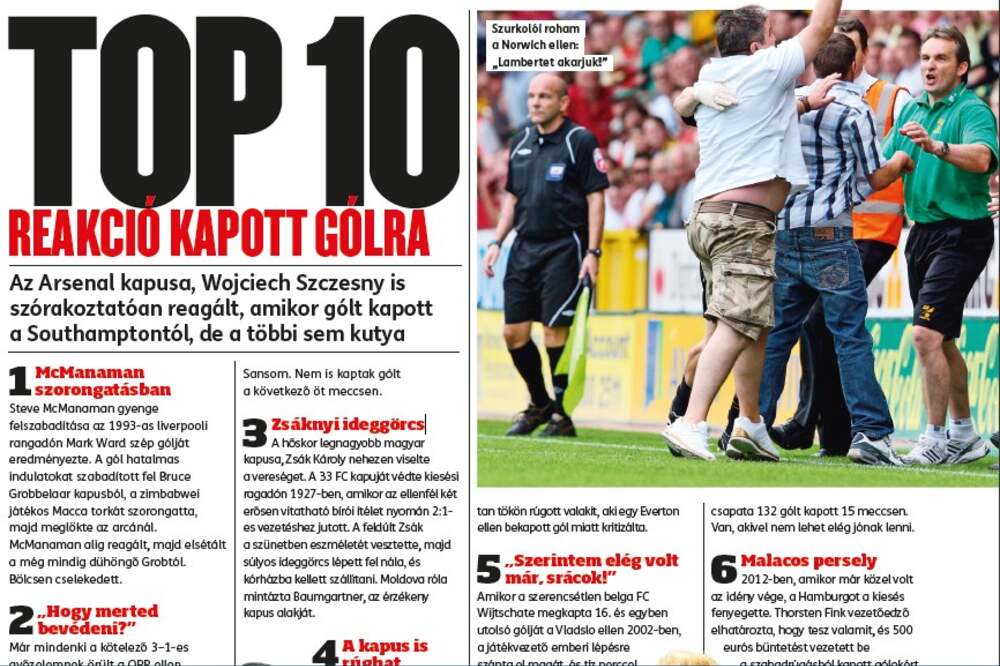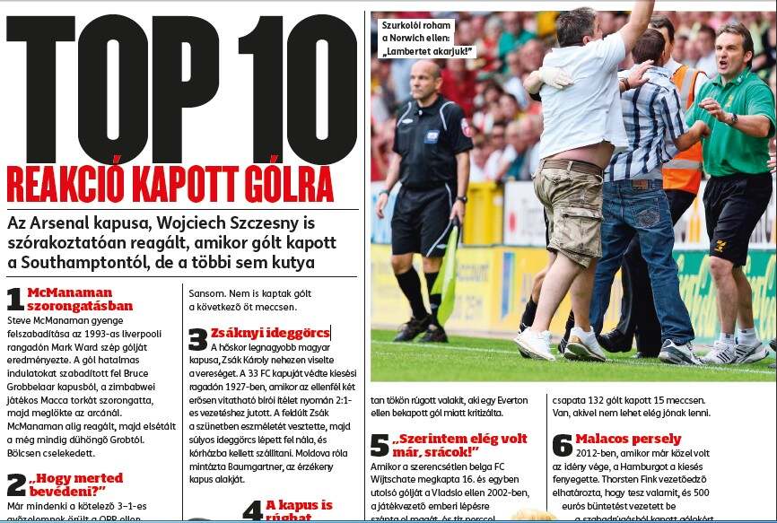 2„Hogy merted bevédeni?” Már mindenki a kötelező 3–1-es győzelemnek örült a QPR ellen 1986 decemberében. Az Arsenal szurkolói nem is tudhattak róla, hogy az őrjöngő George Graham menedzser lila fejjel üvöltötte le Kenny Sansom, Viv Anderson, Tony Adams és David O’Leary védőket a kapott gólért az öltözőben. „Azt mondta, nem is akarunk az Arsenal játékosai lenni” – mondta el később Sansom. Nem is kaptak gólt a következő öt meccsen. 3 Zsáknyi ideggörcs A hőskor legnagyobb magyar kapusa, Zsák Károly nehezen viselte a vereséget. A 33 FC kapuját védte kiesési ragadón 1927-ben, amikor az ellenfél két erősen vitatható bírói ítélet nyomán 2:1- es vezetéshez jutott. A feldúlt Zsák a szünetben eszméletét vesztette, majd súlyos ideggörcs lépett fel nála, és kórházba kellett szállítani. Moldova róla mintázta Baumgartner, az érzékeny kapus alakját.
