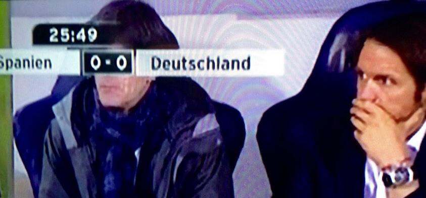 Németország barátságos mérkőzésen 1-0-ra legyőzte Spanyolországot. A meccset közvetítő német csatorna emberei még gól nélküli állásnál igen furcsa, egyben vicces módon helyezték el a találkozó állását, ezen a vendégek mestere, Joachim Löw szemei igencsak érdekes pozícióban vannak.