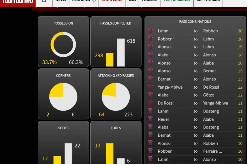 Tán nincs ember a földön, aki azt mondta volna, hogy a Roma hazai pályán 7-1-re kap majd ki a Bayern Münchentől. A mérkőzés esélyese természetesen a bajor csapat volt, de arra senki nem számított, hogy a németek lemossák a pályáról az olaszokat. Persze, vannak olyan meccsek, melyeken a statisztikai adatok nem támasztják alá az egyik csapat nagyarányú győzelmét, de a Roma-Bayern összecsapás nem tartozik ebbe a kategóriába. A Bayern ugyanis a mérkőzés 66 százalékában birtokolta a labdát, játékosai 618 alkalommal passzoltak pontosan, hat szöglet mellett 22 alkalommal lőttek kapura, és tizenegyszer el is találták a kaput. Erre mondják: meggyőző fölényben játszott a Bayern.