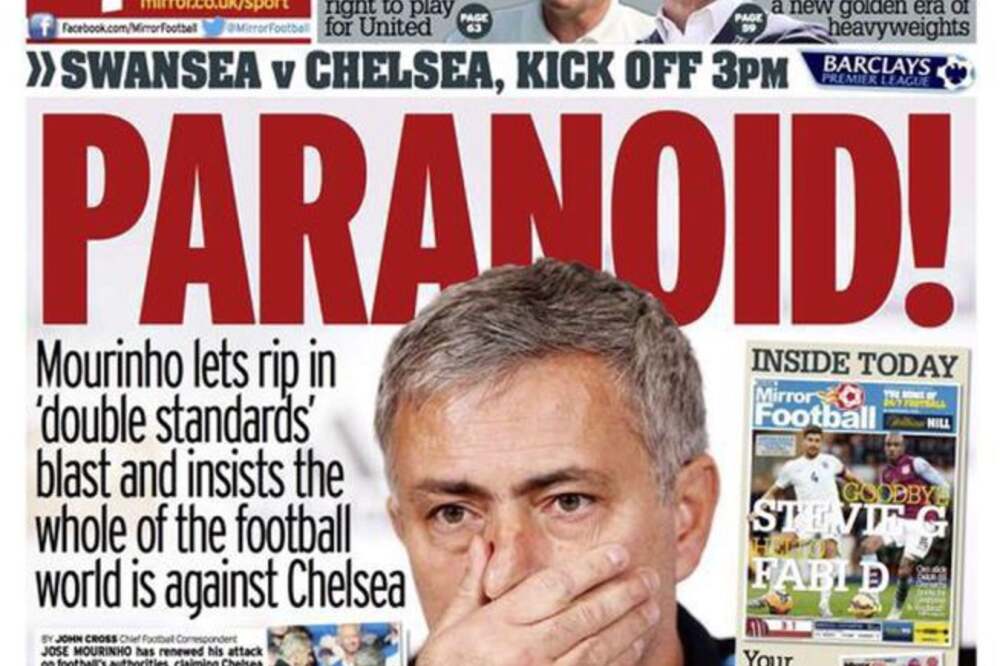 Nem Special One és nem is Only One. A brit Mirror Sport legfrissebb címlapján nemes egyszerűséggel paranoidnak nevezte el José Mourinhót. Ki tudja, talán tényleg ez a legmegfelelőbb jelző a Chelsea menedzserére.