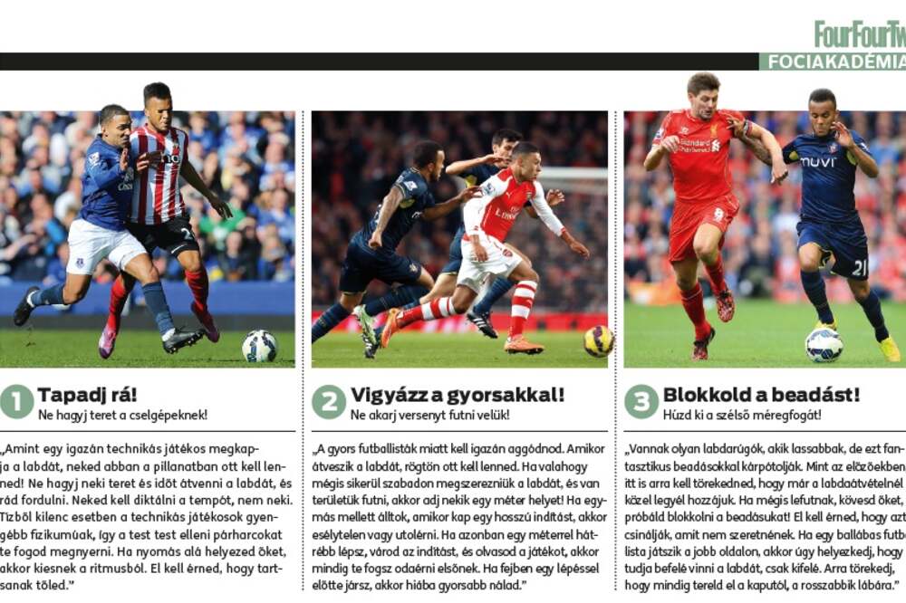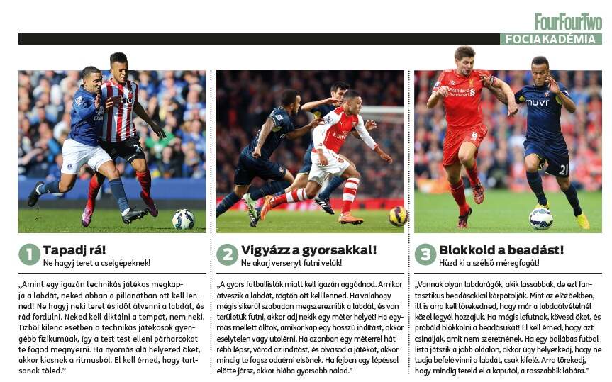 1 – Tapadj rá! „Amint egy igazán technikás játékos megkapja a labdát, neked abban a pillanatban ott kell lenned! Ne hagyj neki teret és időt átvenni a labdát, és rád fordulni. Neked kell diktálni a tempót, nem neki. Tízből kilenc esetben a technikás játékosok gyengébb fizikumúak, így a test test elleni párharcokat te fogod megnyerni. Ha nyomás alá helyezed őket, akkor kiesnek a ritmusból. El kell érned, hogy tartsanak tőled.” 2 – Vigyázz a gyorsakkal! „A gyors futballisták miatt kell igazán aggódnod. Amikor átveszik a labdát, rögtön ott kell lenned. Ha valahogy mégis sikerül szabadon megszerezniük a labdát, és van területük futni, akkor adj nekik egy méter helyet! Ha egymás mellett álltok, amikor kap egy hosszú indítást, akkor esélytelen vagy utolérni. Ha azonban egy méterrel hátrébb lépsz, várod az indítást, és olvasod a játékot, akkor mindig te fogsz odaérni elsőnek. Hafejben egy lépéssel előtte jársz, akkor hiába gyorsabb nálad.”