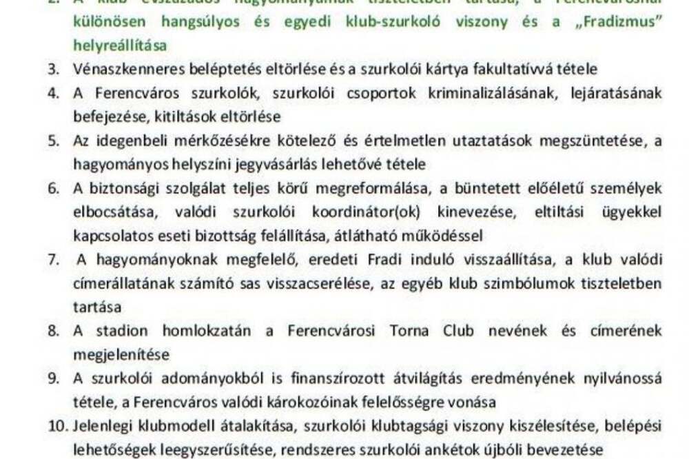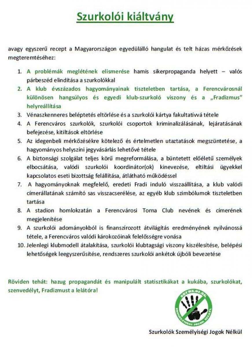 Bár telt ház volt a hétvégi, Ferencváros-Újpest mérkőzésen, a fanatikusok, azaz az ultrák távolmaradásukkal tüntettek. Ugyanígy tettek egyébként a Videoton szurkolói is a hétvégi mérkőzésen. A Ferencváros szurkolói most nyilvánosságra hozták 10 pontból álló szurkolói kiáltványukat. Íme...