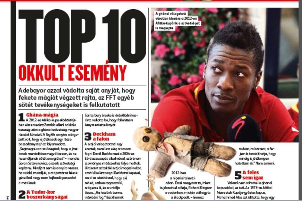 1. Ghána-mágia A 2012-es Afrika-kupa elődöntőjében elszenvedett Zambia elleni sokkoló vereség után a_ghánai szövetség agyarázatot követelt. A légkör annyira mérgezett volt, hogy a játékosok egy része boszorkánysághoz folyamodott. „Segítségre van szükségünk, hogy a játékosok mentalitása megváltozzon, és ne használjanak sötét energiákat” – mondta Goran Sztevanovics, a szerb szövetségi kapitány. Mindjárt nem is annyira vészes, ha valaki, mondjuk, a csapattársa feleségével hál, vagy nem hajlandó passzolni a másiknak.