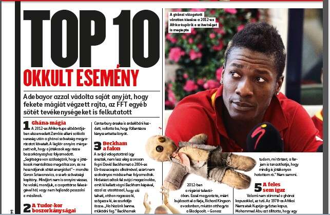 1. Ghána-mágia A 2012-es Afrika-kupa elődöntőjében elszenvedett Zambia elleni sokkoló vereség után a_ghánai szövetség agyarázatot követelt. A légkör annyira mérgezett volt, hogy a játékosok egy része boszorkánysághoz folyamodott. „Segítségre van szükségünk, hogy a játékosok mentalitása megváltozzon, és ne használjanak sötét energiákat” – mondta Goran Sztevanovics, a szerb szövetségi kapitány. Mindjárt nem is annyira vészes, ha valaki, mondjuk, a csapattársa feleségével hál, vagy nem hajlandó passzolni a másiknak.