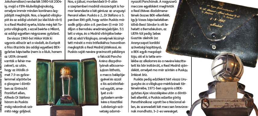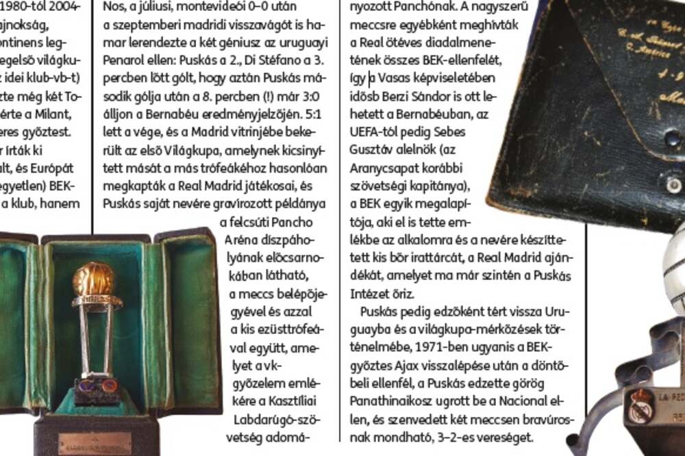 A magyar foci egyelőre csak a múltjára lehet büszke, de nincs a sportágnak múzeuma, archívuma, könyvtára. Pontosabban: eddig nem volt. Mert Felcsúton elkezdődött a leendő Puskás Intézet gyűjteményének feldolgozása, bővítése, rendszerezése. A kollekció alapját a Spanyolországból 2011-ben hazakerült hatalmas Puskás-örökség adja, de az akadémián gyűjtenek minden tárgyat, fotót, trófeát, dokumentumot, ami a magyar foci régmúlt dicsőségét hirdeti. Az FFT hónapról hónapra előkotor valamit, és megmutatja olvasóinak. Ezúttal a Real Madrid által az idén elnyert klubvilágbajnoki trófea kapcsán elevenítjük fel az első diadalt, amikor a fehéreket koronázták a klubok királyának, soraikban természetesen Puskás Ferenccel, akinek hagyatékában az 1960-as trófea is szerepel.