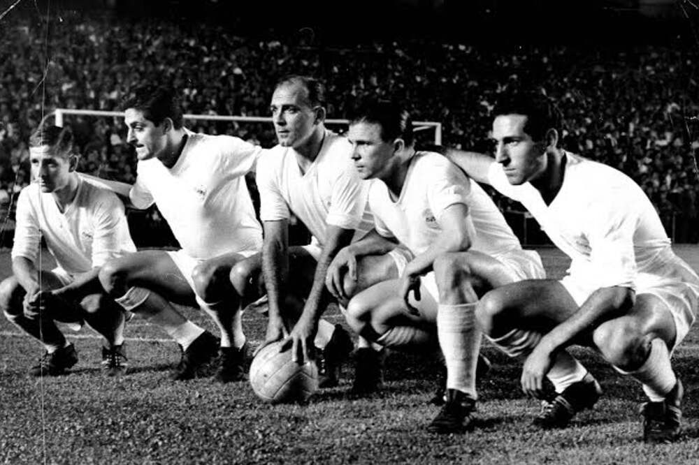 A BEK hőskorszakában utolérhetetlen csapat csatársorában a kép közepén, Puskás Ferenc jobbján Alfredo Di Stéfano (fotó: Puskás Intézet)
